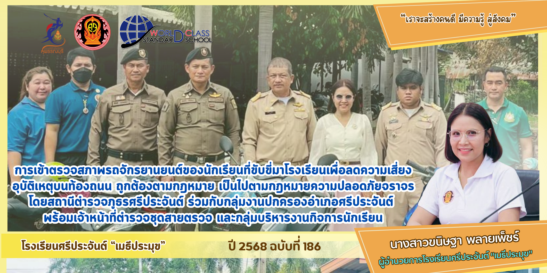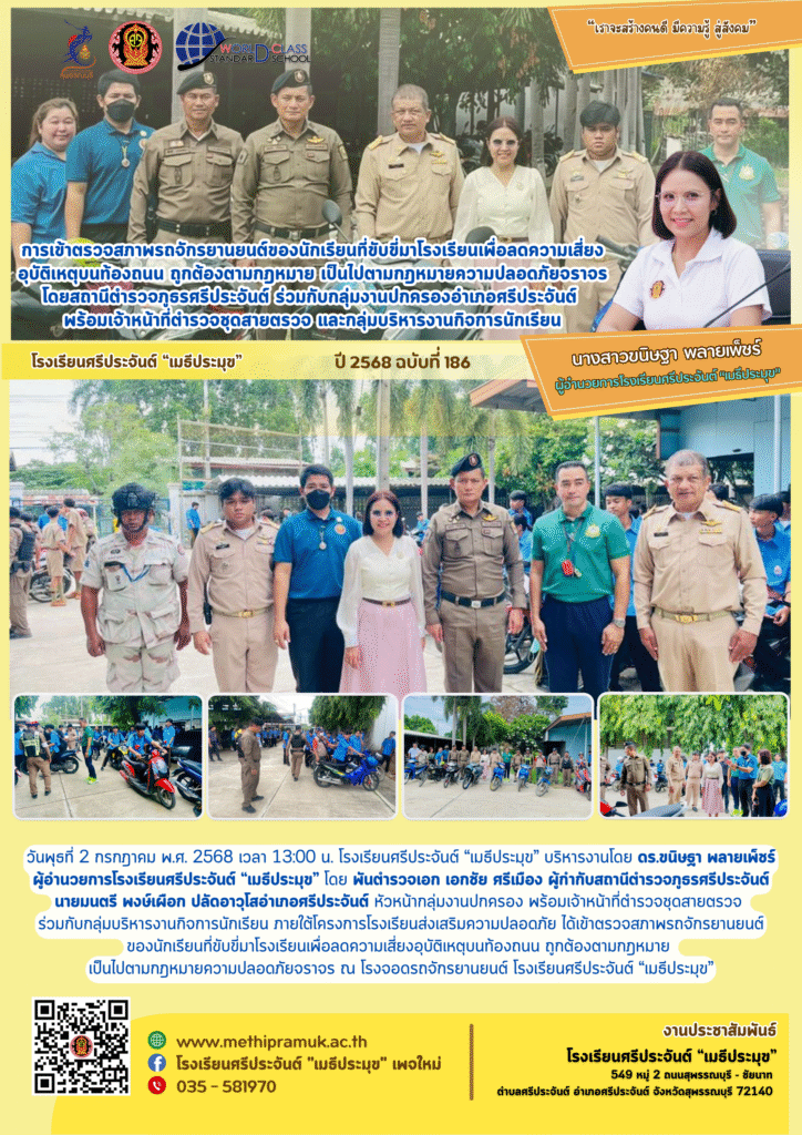 การเข้าตรวจสภาพรถจักรยานยนต์ของนักเรียนที่ขับขี่มาโรงเรียนเพื่อลดความเสียงอุบัติเหตุบนท้องถนน ถูกต้องตามกฎหมาย เป็นไปตามกฎหมายความปลอดภัยจราจรโดยสถานีตำรวจภูธรศรีประจันต์ ร่วมกับกลุ่มงานปกครองอำเภอศรีประจันต์พร้อมเจ้าหน้าที่ตำรวจชุดสายตรวจ และกลุ่มบริหารงานกิจการนักเรียน