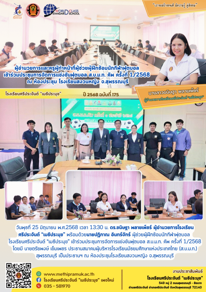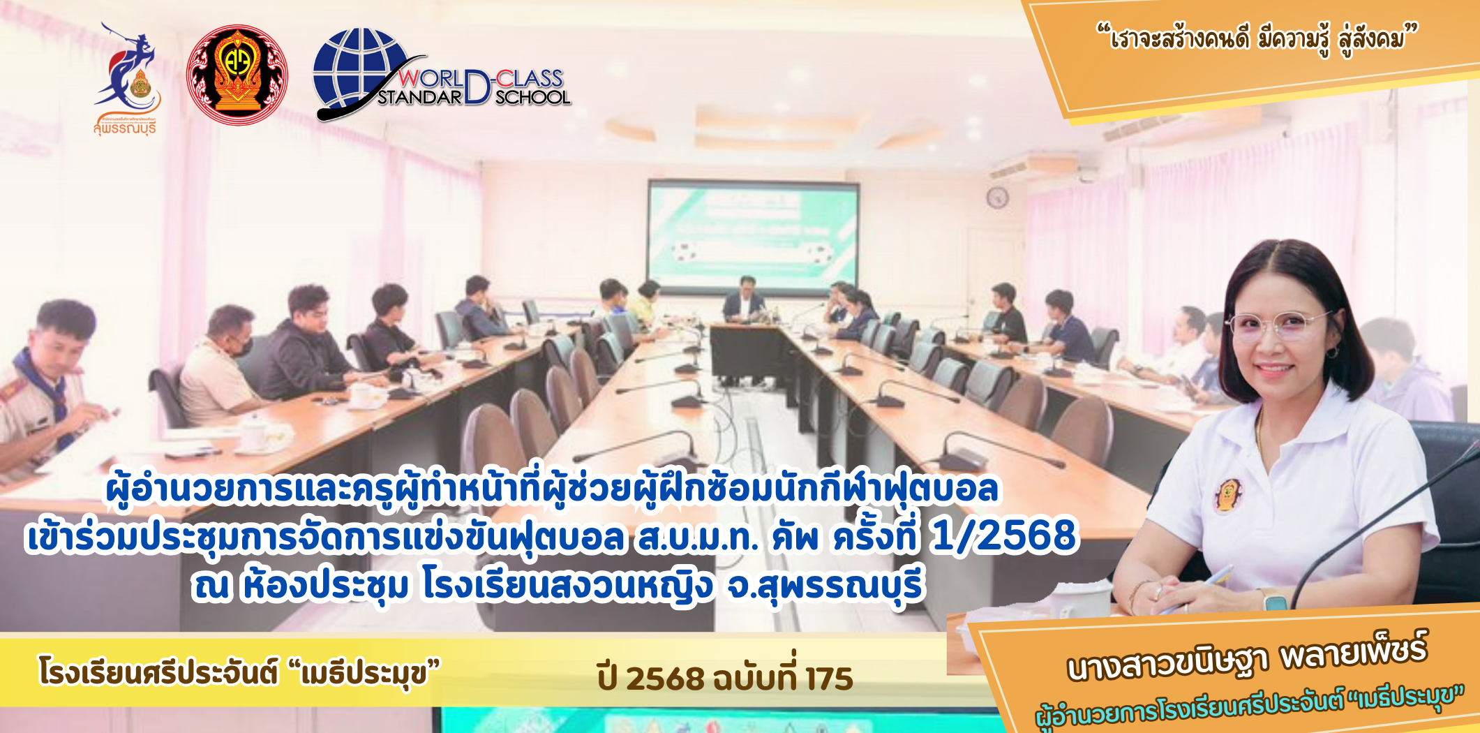 ผู้อำนวยการและครูผู้ทำหน้าที่ผู้ช่วช่วยผู้ฝีข้อมนักที่ที่กำหาฟุตบอลเข้าร่วมประชมการจัดการแข่งขั้นฟุตบอล ส.ม.ม.ท. ครั้งที่ 1/256568ณ ห้องประชุม โรงเรียนสงวนหญิง จ.สุพรรณบุรี