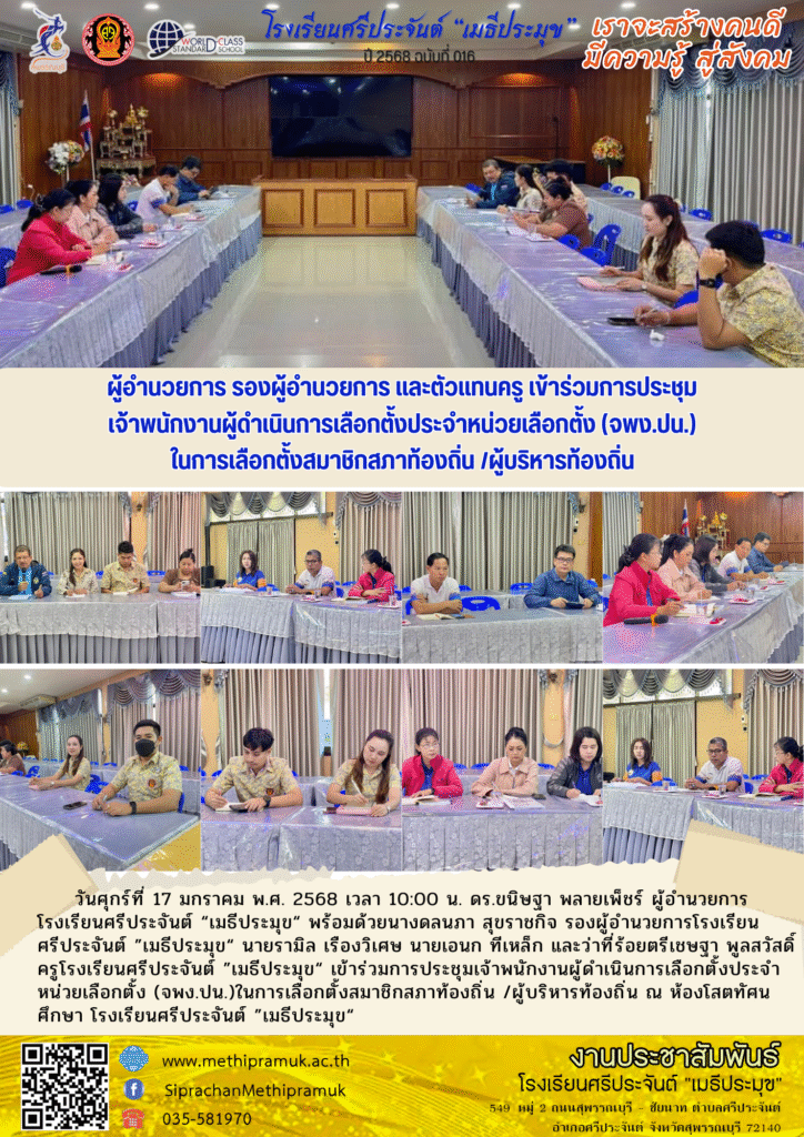 ผู้อำนวยการ รองผู้อำนวยการ และละตัวแทนครู เข้าร่วมการประชุมเจ้าพนักงานผู้ดำเนินการเลือกตั้งประจำหน่วยเลือกตั้ง (จพง.ปน.)ในการเลือกตั้งสมาชิกสภาท้องถิ่น /ผู้บริหารท้องถิ่น