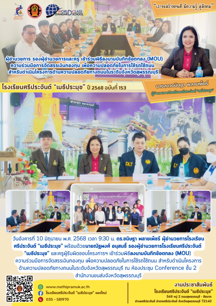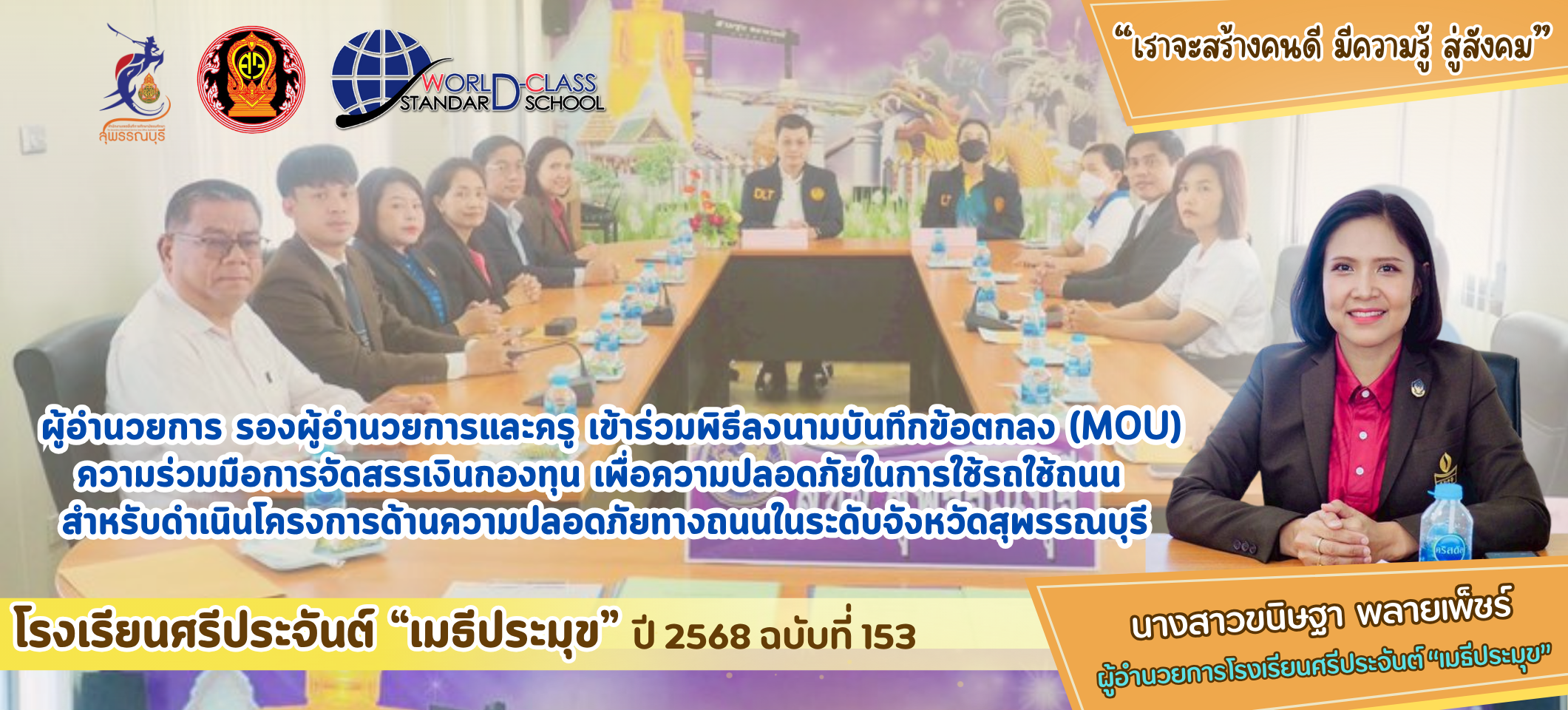 ผู้อำนวยการ รองผู้อำนวยการและละครู เข้าร่วมพิธีลงนามบันทึกข้อตกลง (MOU)ความร่วมมือการจัดสรรเงินทองทุน เพื่อความปลอดภัยในการใช้รถใช้ถนนสำหรับด่าเนินโครงการด้านความปลอดภัยทางถนนในระดับจังหวัดสุพรรณบุรี