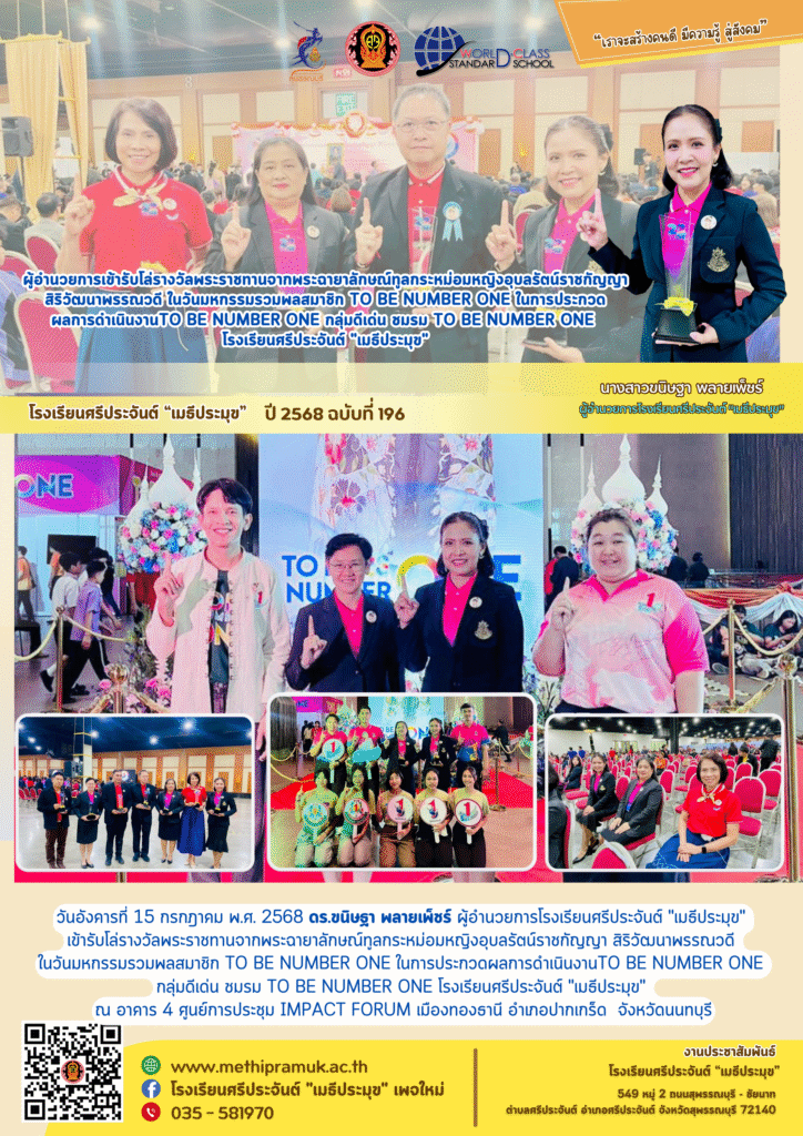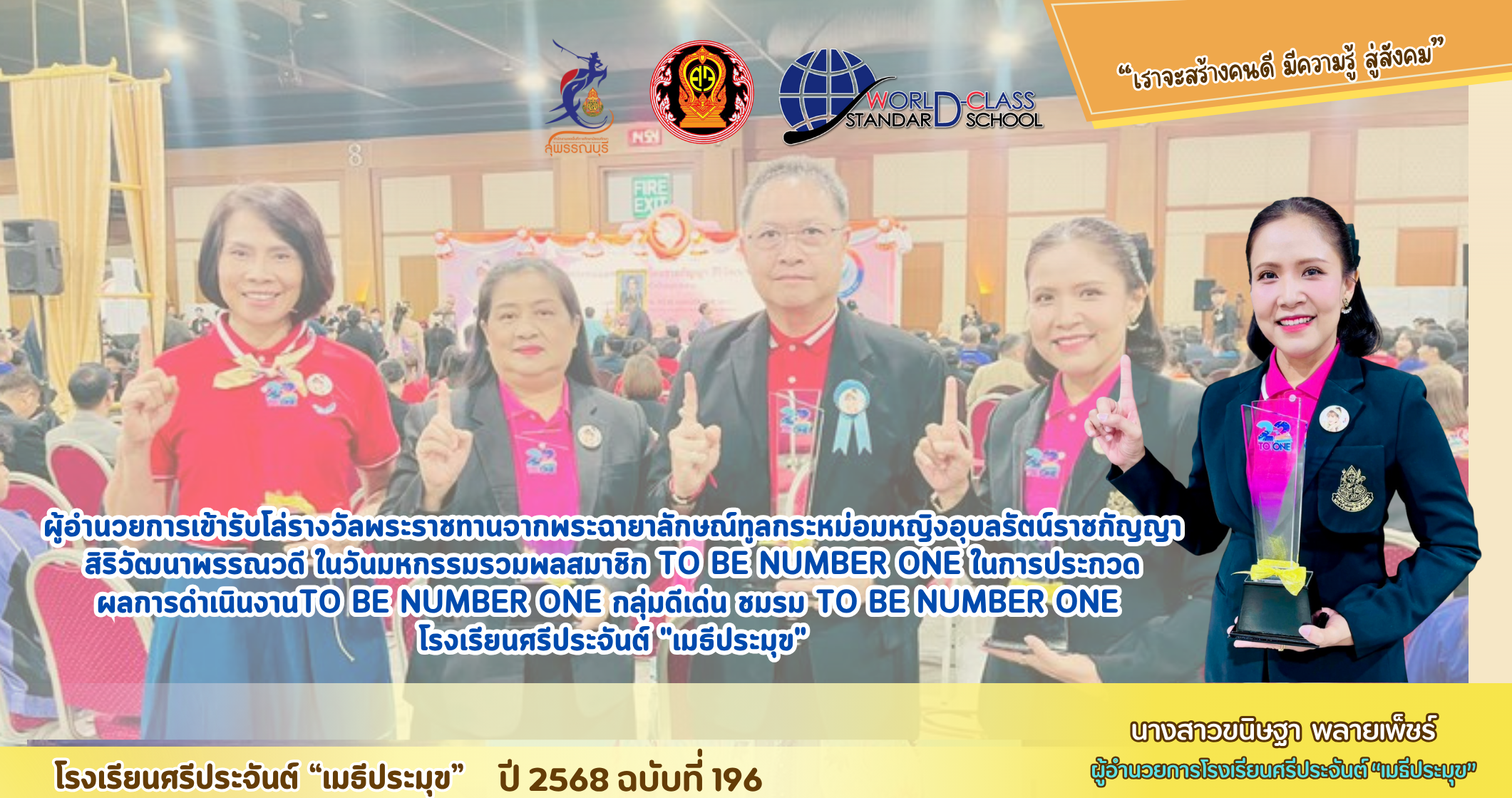 ผู้อ่านวยการเข้ารับโล่รางวัลพระราชทานจากพระฉายาลักษณ์ทูลกระหม่อมหญิงอบลรัตน์ราชกัญญาสิริวัฒนาพรรณวดี ในวันมหกรรมรวมพลสมาชิก TO BE NUMBER ONE ในการประกวดผลการดำเนินงานTO BE NUMBER ONE กลุ่มดีเด่น ชมรม TO BE NUMBER ONEโรงเรียนศรีประจันต์ “เมธีประมุข”