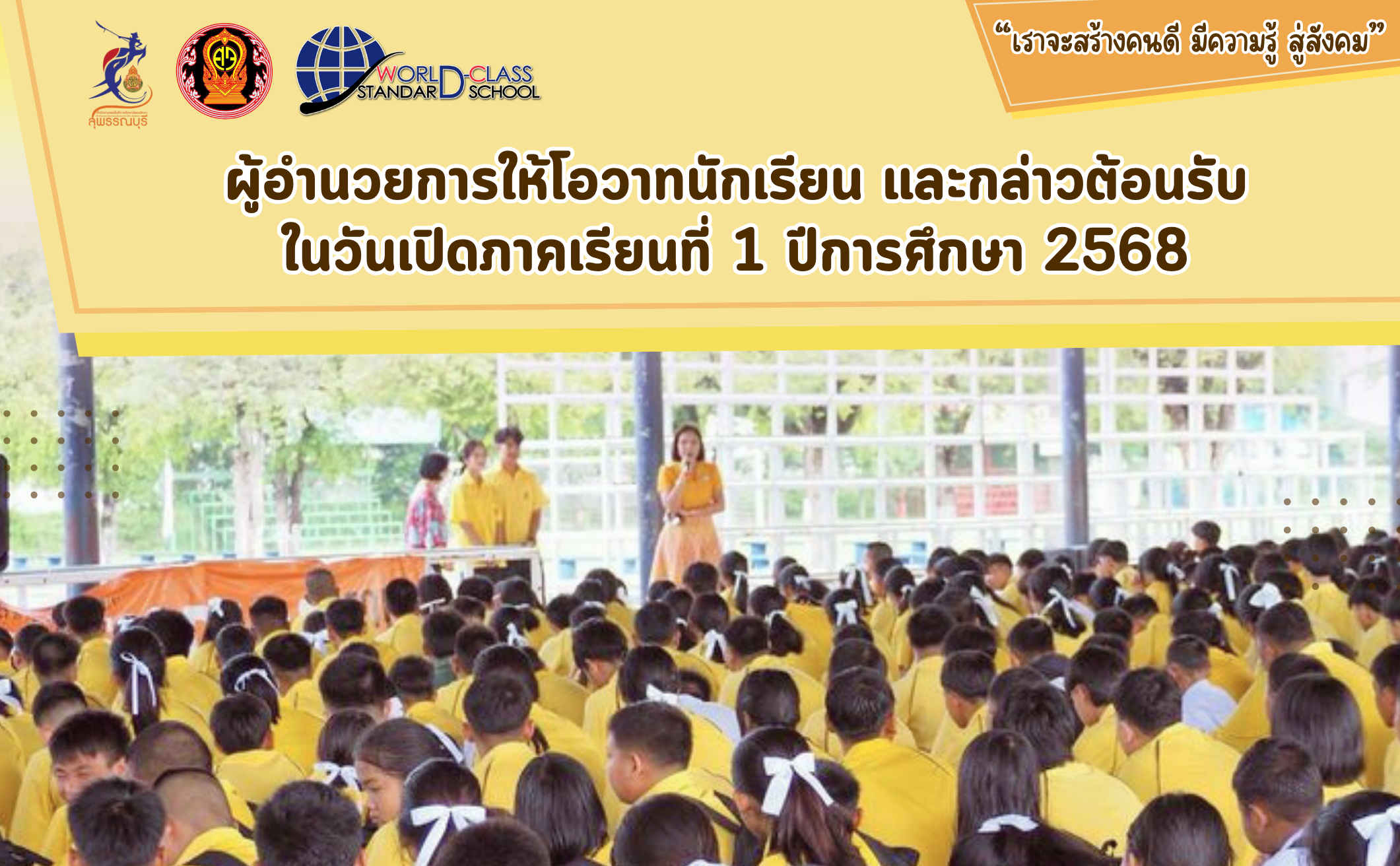 ผู้อ่านวยการให้โอวาทนักเรียน และกล่าวต้อนรับในวันเปิดภาคเรียนที่ 1 ปีการศึกษา 2568