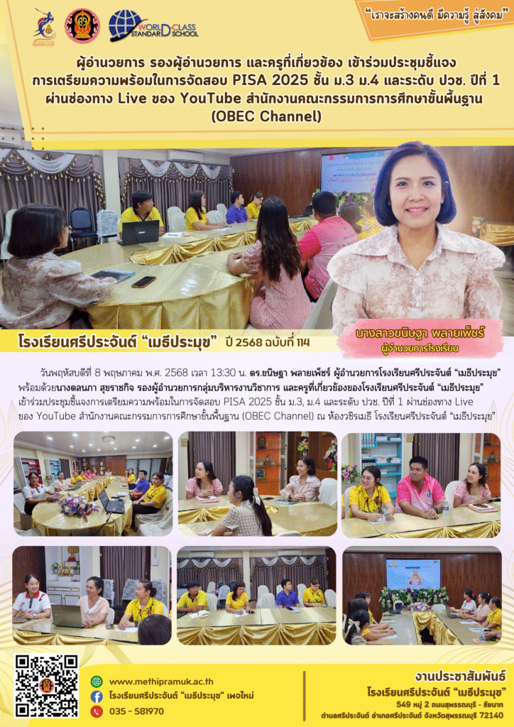 ผู้อ่านวยการ รองผู้อ่านวยการ และครูที่เกี่ยวข้อง เข้าร่วมประชุมชี้แจงการเตรียมความพร้อมในการจัดสอบ PISA 2025 ชั้น ม.3 ม.4 และระดับ ปวช. ปีที่ 1ผ่านช่องทาง Live ของ YouTube สำนักงานคณะกรรมการการศึกษาขั้นพื้นฐาน(OBEC Channel)