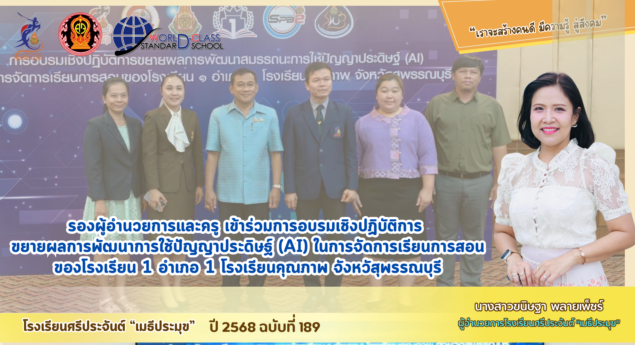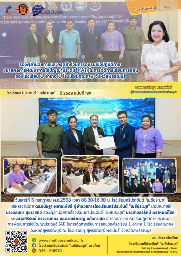 รองผู้อำนวยการและครู เข้าร่วมทารอบรมเช็งปฏิบัติการขยายผลการพัฒนาการใช้ปัญญาประดิษฐ์ (AI) ในการจัดการเรียนการสอนของโรงเรียน 1 อำเภอ 1 โรงเรียบคุณภาพ อังหวัสุพรรณบุรี
