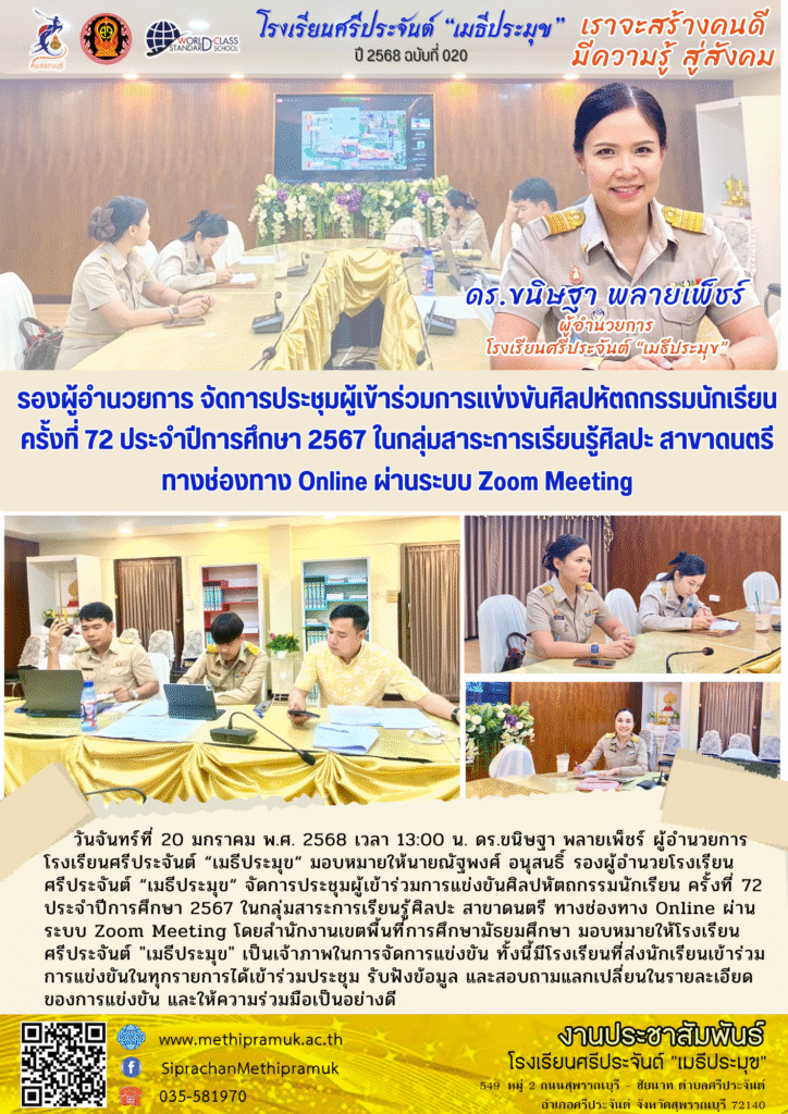 รอบผู้อำนวยการ จัดการประชุมผู้เข้าร่วมการแรแข่งข้นศิลปหัตกกรรมนักเรียบครั้งที่ 72 ประจําปีการศึกษา 2567 ในกลุ่มสาระการเรียนรู้ศีลปะ สาขาดบตรีทางช่องทาง Online ผ่านระบบ Zoom Meeting